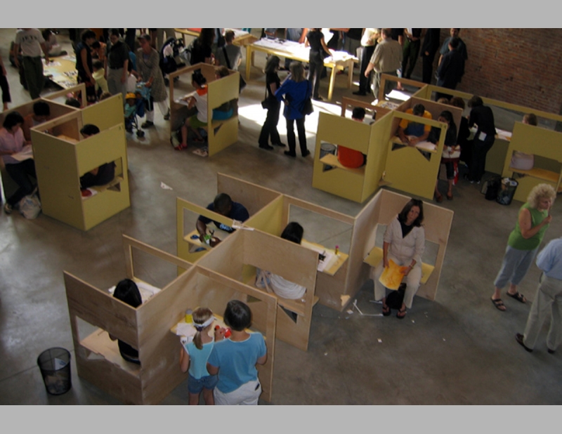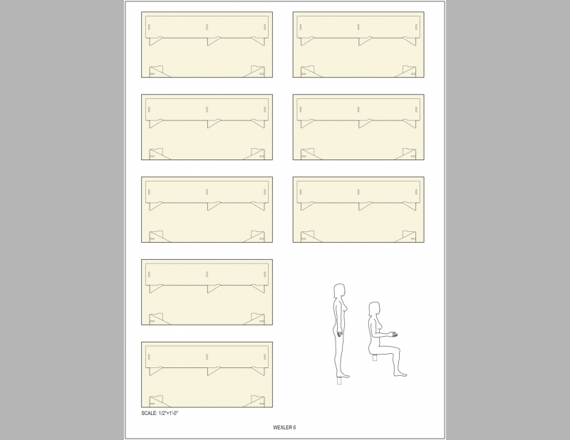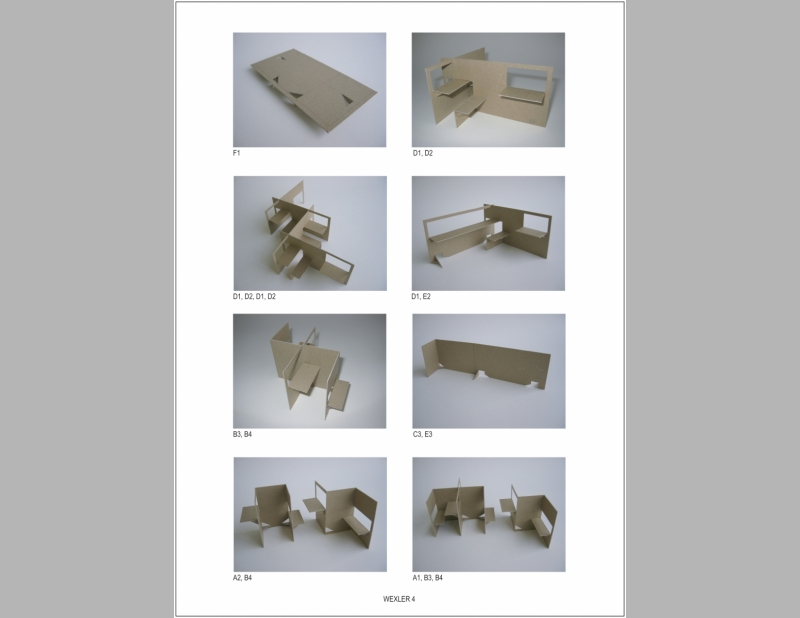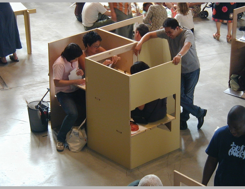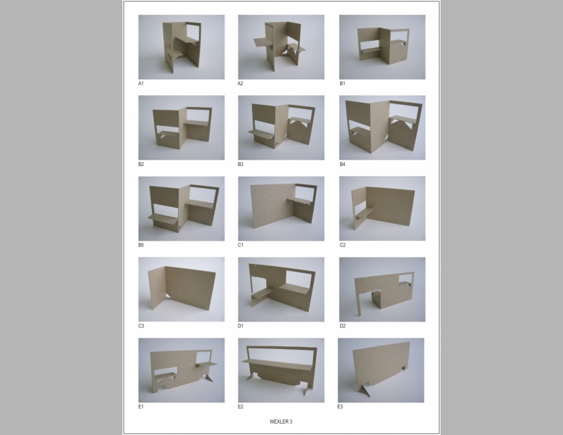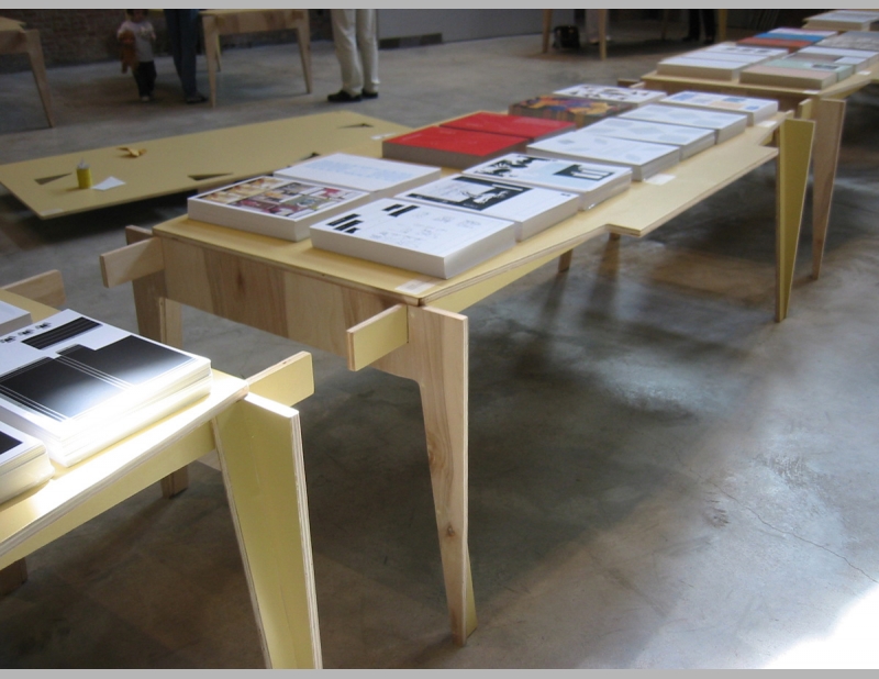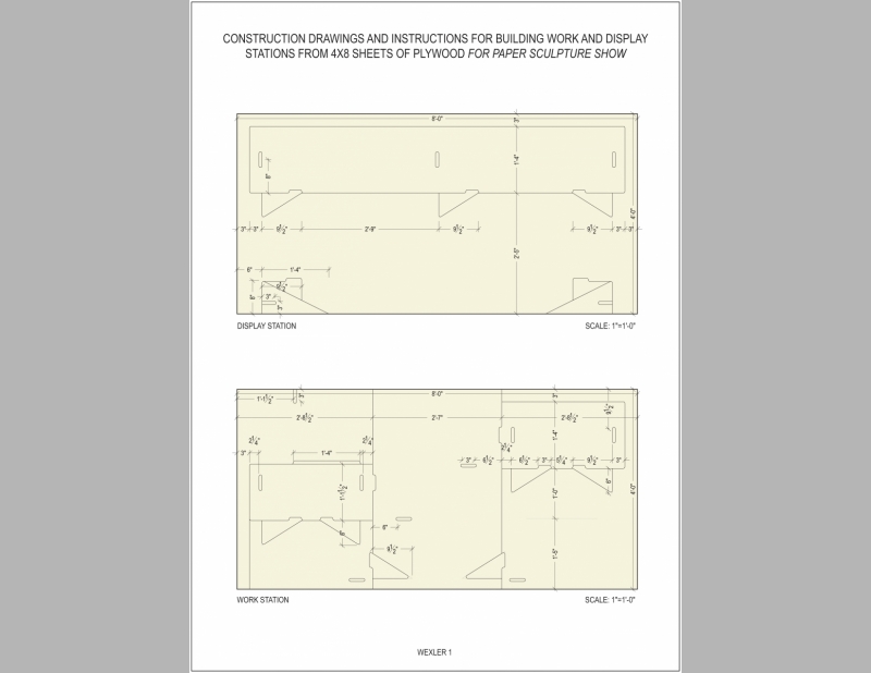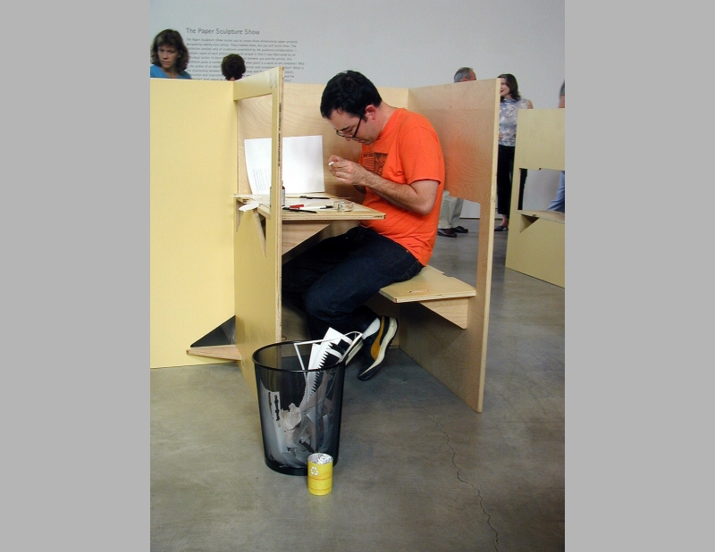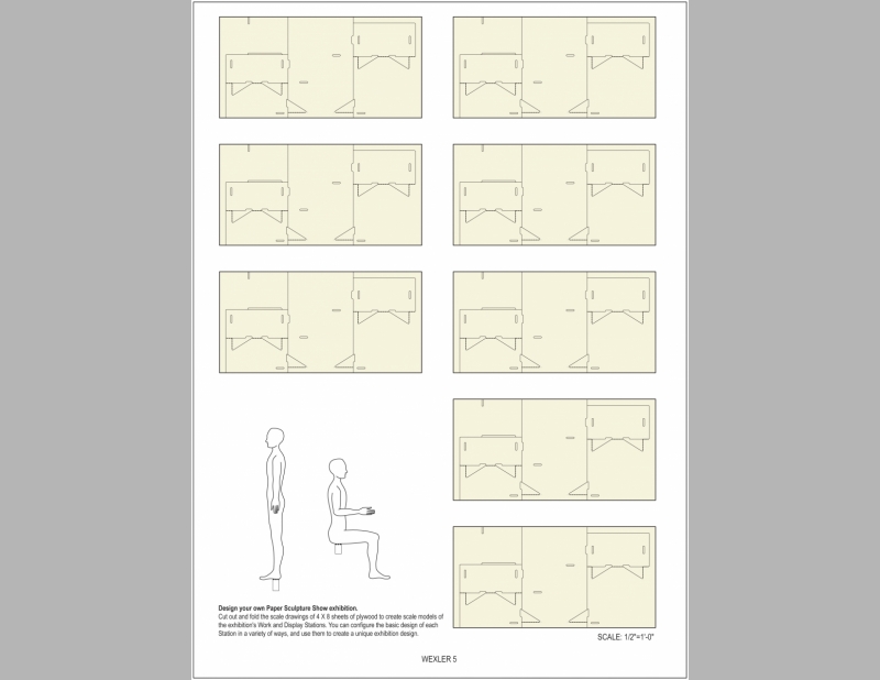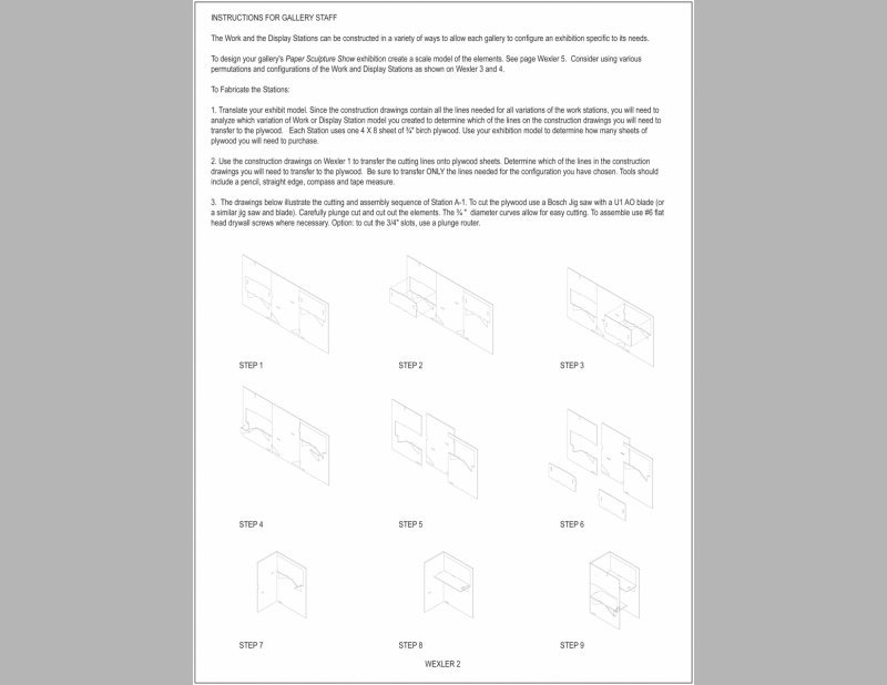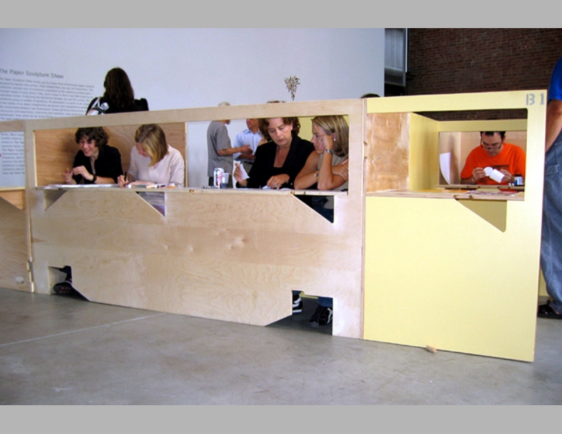 The Paper Sculpture Show originated at the Sculpture Center and simultaneously showed at art galleries throughout the country. All elements are constructed from one 4’ x 8’ sheet of plywood. Elements include work stations in the gallery space where visitors can sit to construct the paper sculptures and tables of varying heights for display. Folded Furniture was designed to be easily, quickly and inexpensively constructed by each venue and multiple designs allow for flexible for use in any size and configuration of exhibition space.