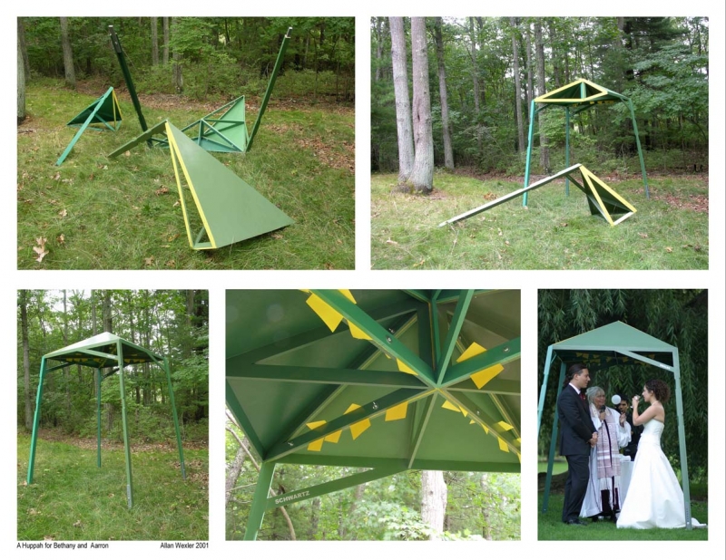 Four triangles arranged in a square produce a tetrahedron. The form of the Huppah is a tetrahedron. This Huppah represents the balance of the stable and the unstable; permanence and impermanence.