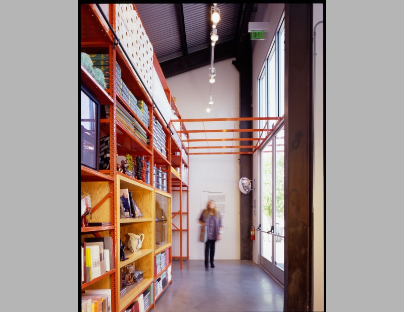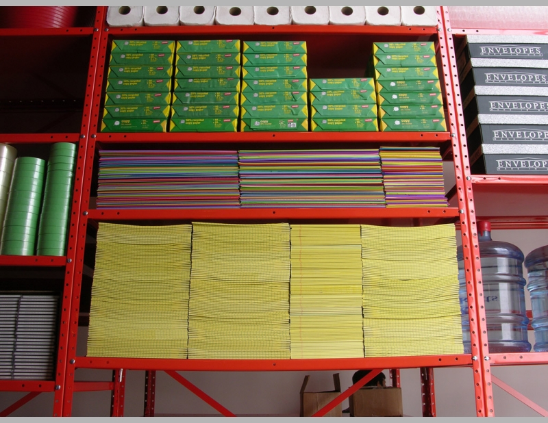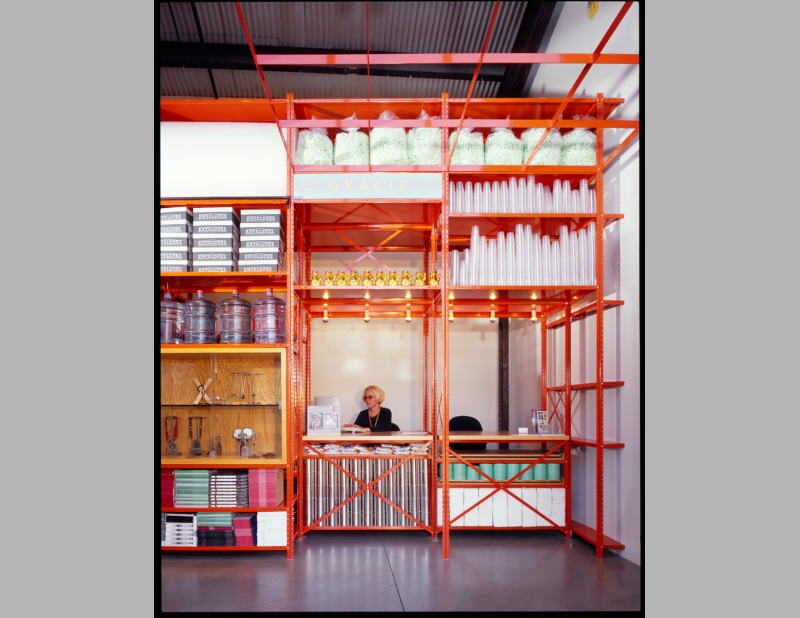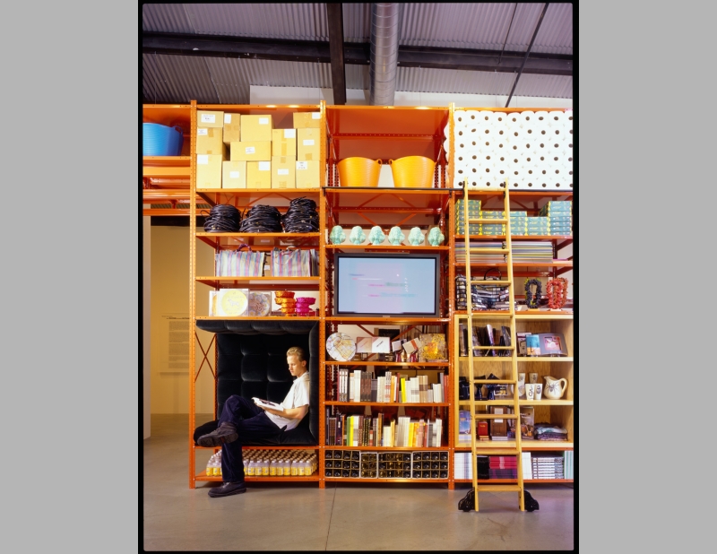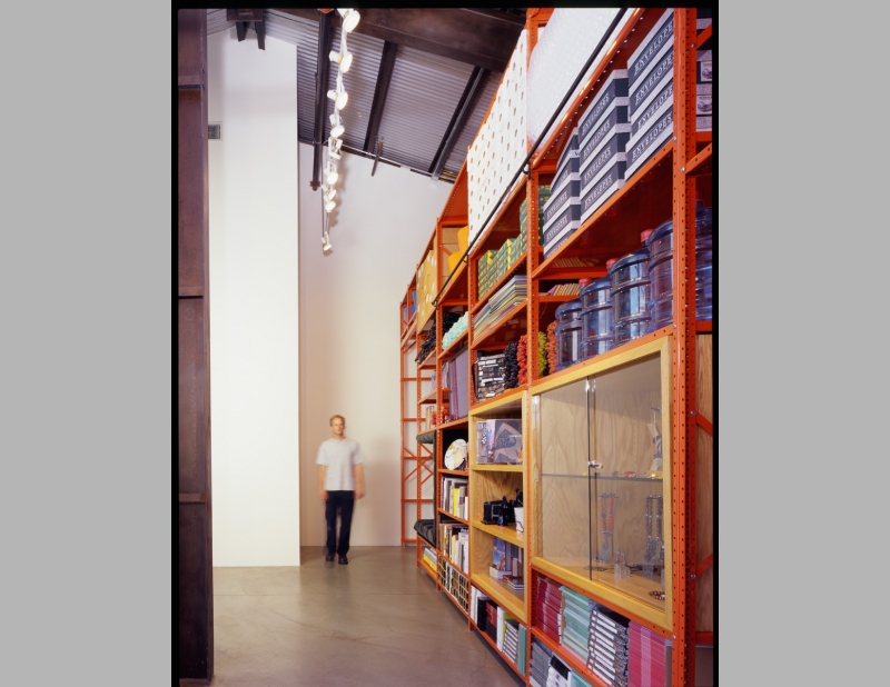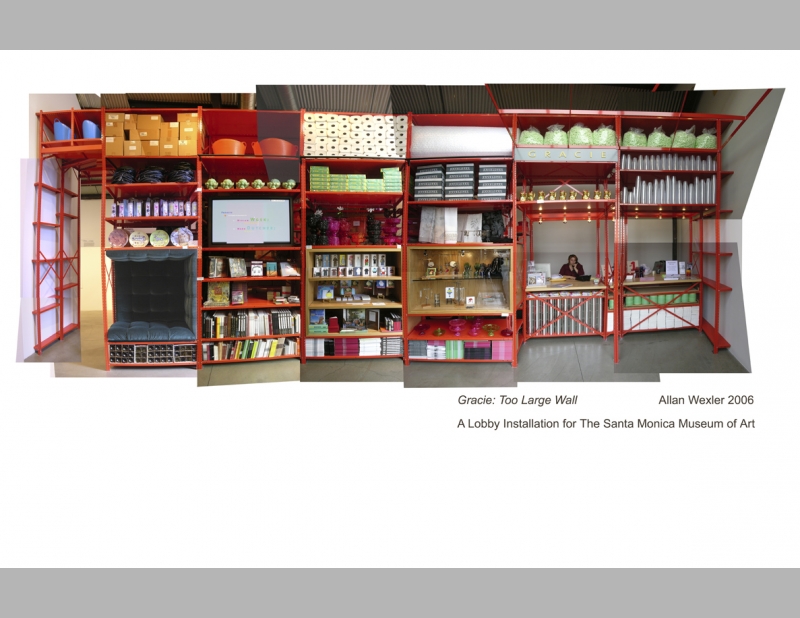 Too Large Wall is simultaneously a collection, a billboard, storage, sculpture, furniture, installation and architecture. It questions what is functional and what art is, what is beautiful and what can be beautiful if we ever so slightly shift our vision. It is a skewed wall that interrupts the museum. Made from industrial shelving, this is a cabinet of wonder. The Museum’s back room storage is brought forward; their garage, basement and attic are on display like the mind of a thoughtful person with a head full of ideas. The shelving is a framework that catalogs and orders confusion and energy. The opacity, translucency and transparency of the wall is controlled by the choice, organization and quantity of the objects stored on the shelves. Everyday objects become precious objects - a collage of Duchampian “ready-mades. The museum’s back storage is now its front entrance.