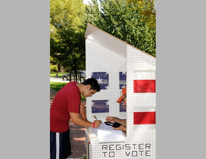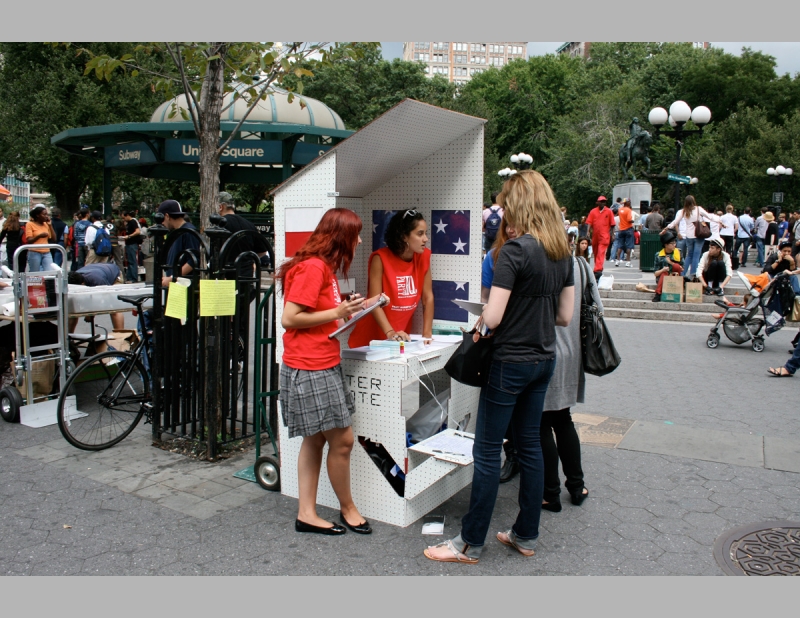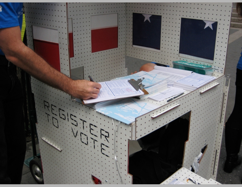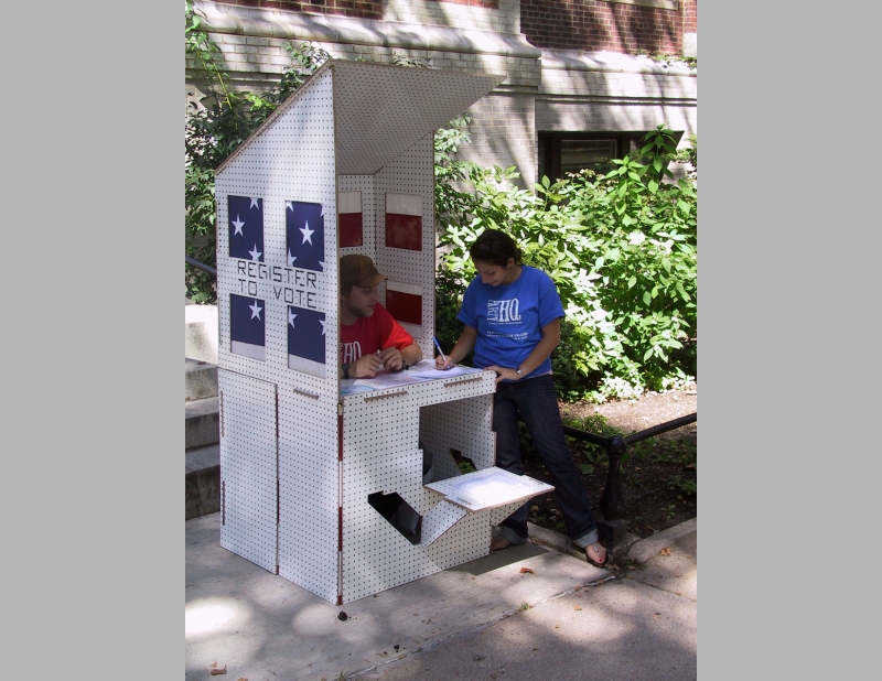The National Voter Registration Center reached out to unregistered citizens to encourage their participation in the 2008 presidential election. Folded into a car and unfurled in minutes on site, the Registration Center will be staffed by volunteers.