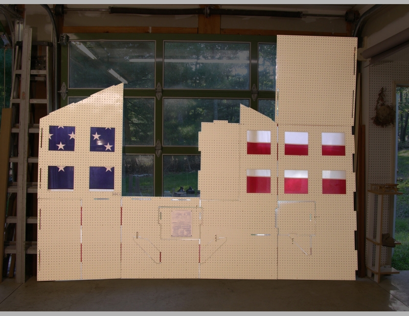The center is constructed from layers of white peg board that sandwich the American flag. The flag unites the independent elements of the structure together acting as a hinge to allow the structure to fold origami-like, into a small peaked roof structure. To make the structure lighter and more transportable areas of the peg board were cut away to reveal the red, white and blue.