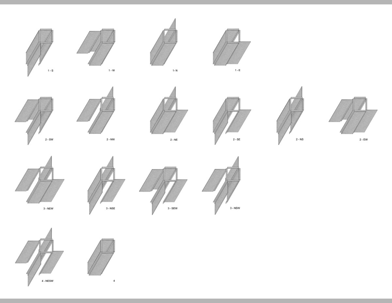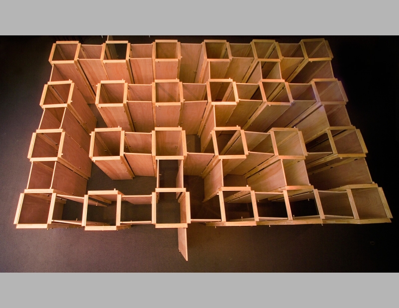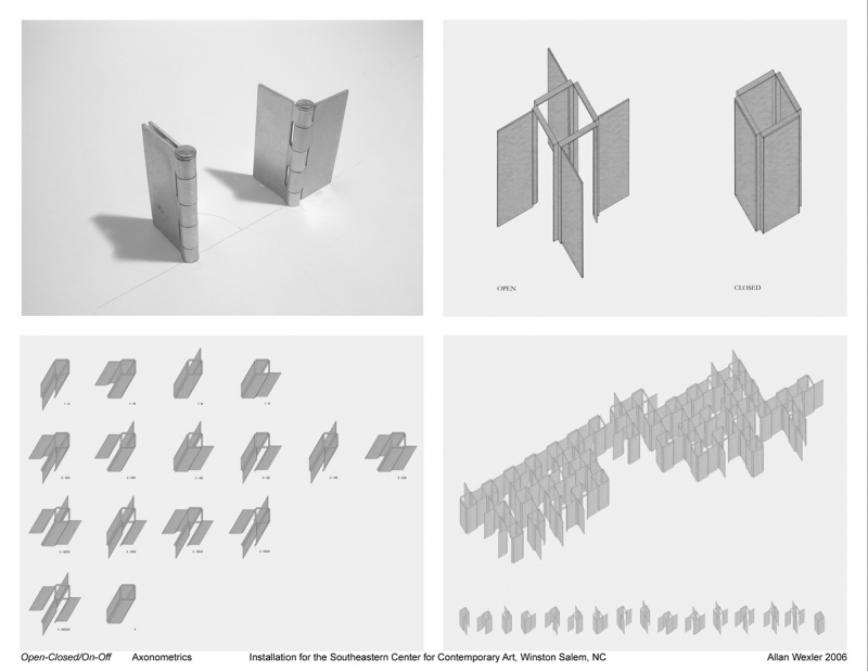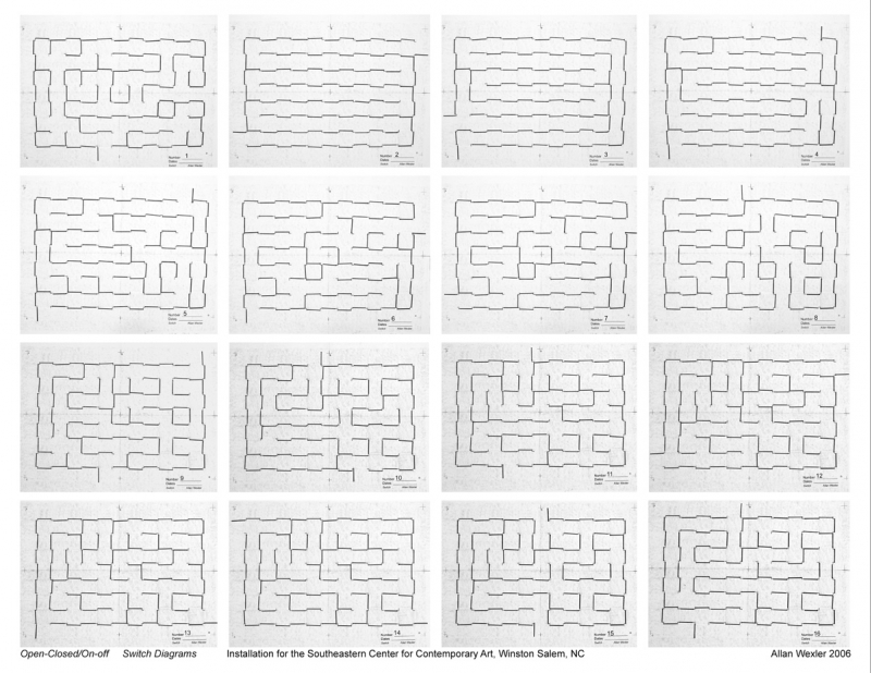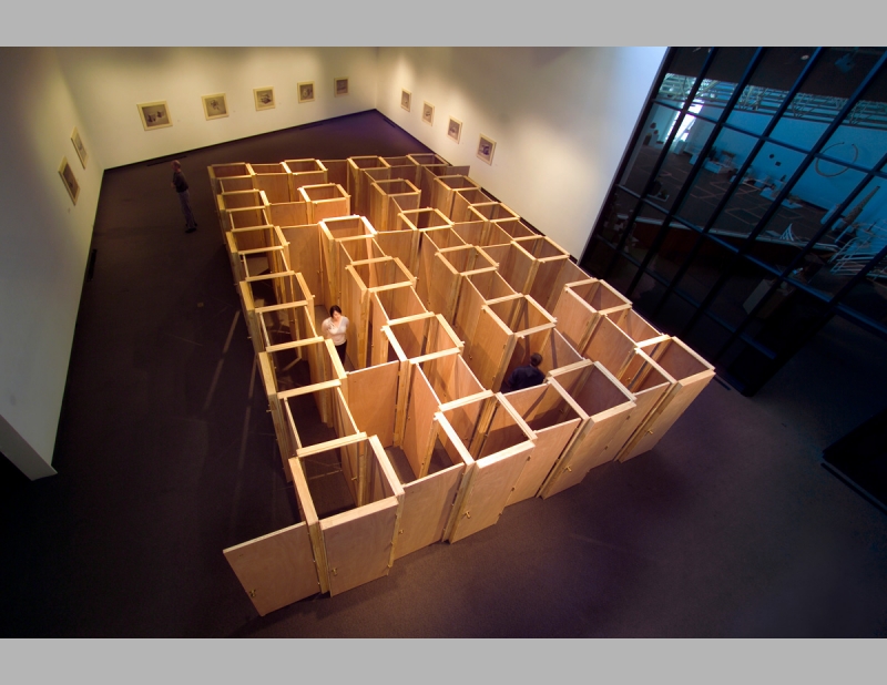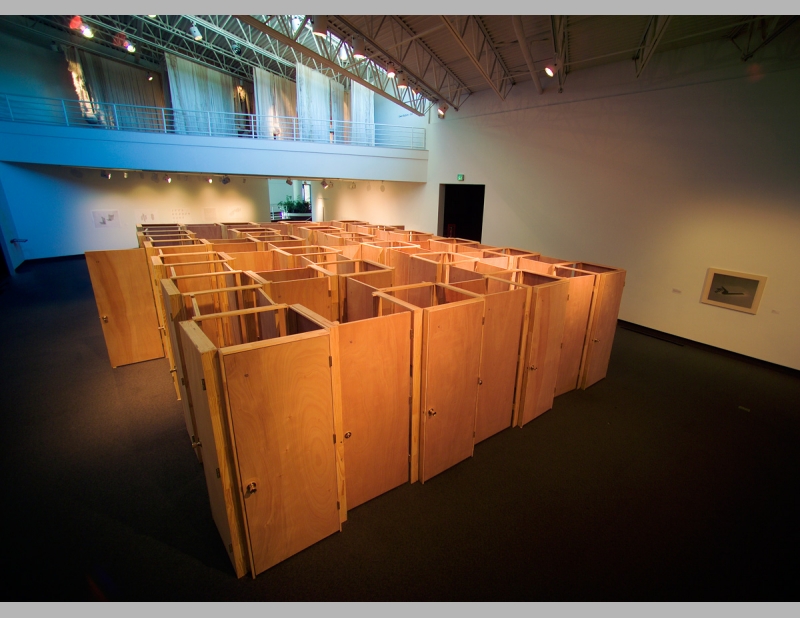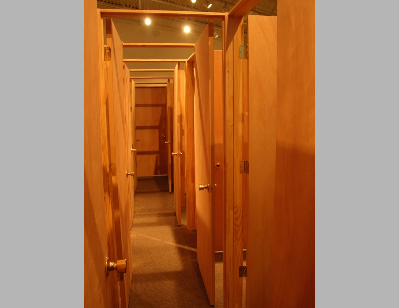 The basic decision to open a door or close a door, like any binary system, creates many complex pathways. Four pre-hung doors are screwed together to make a square module. 24 of these modules of 96 doors are joined leaving a door width between each module. Doors are locked opened or locked closed by the museum staff according to predetermined diagrams to create many pathways. A feeling of seemly endless hallways, closets, pathways of doors open and closed, it feels both like a home and a nightmare.