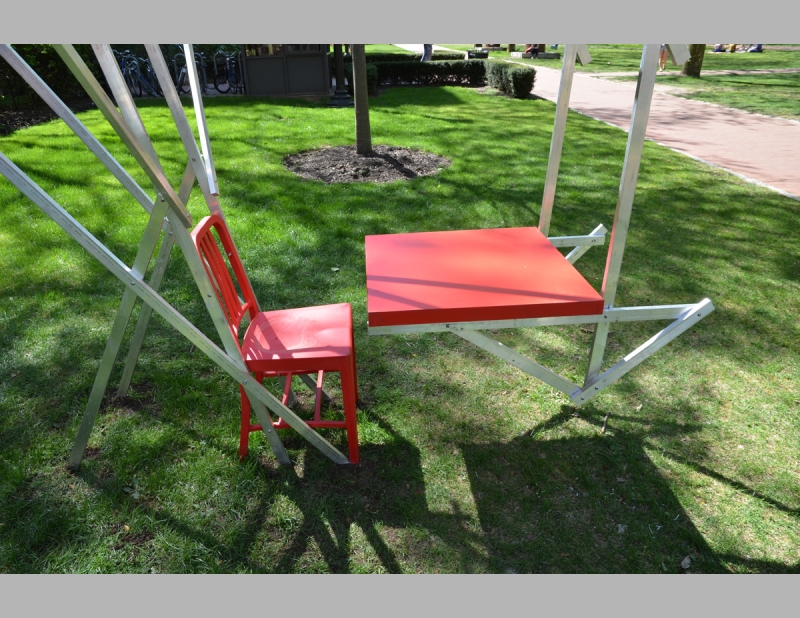 As in Bunraku Puppet Theater where the puppeteer is in full view of the audience, the puppets, the action and the fiction take center stage. The black-outfitted puppeteer seems to disappear. With Pratt Desk, I created a complex network of overhead gravity defying scaffolding to make a simple red plane float. Poetry arises in the space between floating and gravity. Sitting in the chair the occupant becomes a caryatid helping to counterbalance and hold up while being protected beneath the aluminum branching trellis.