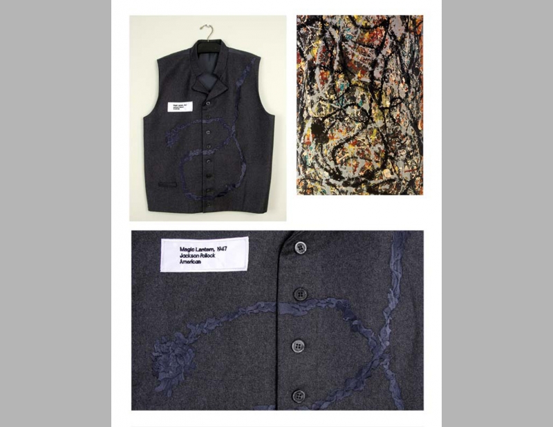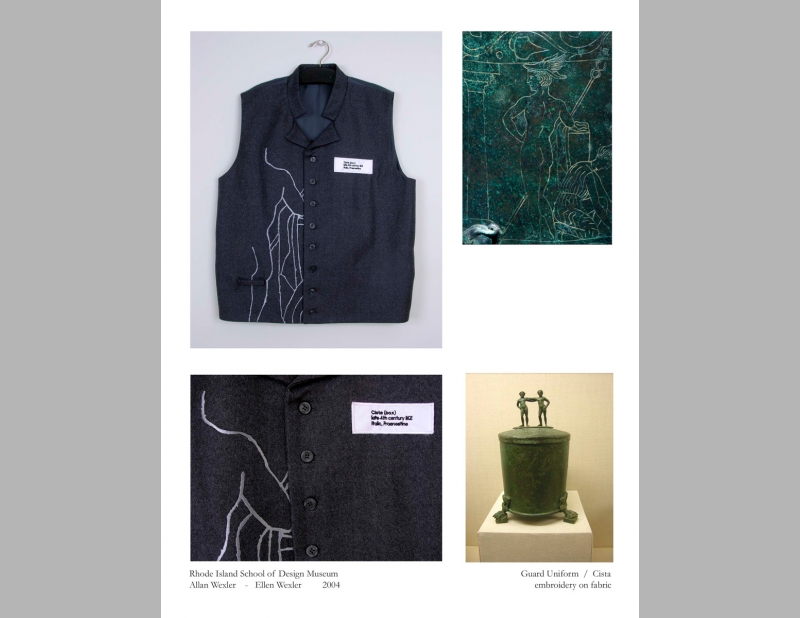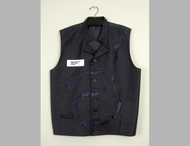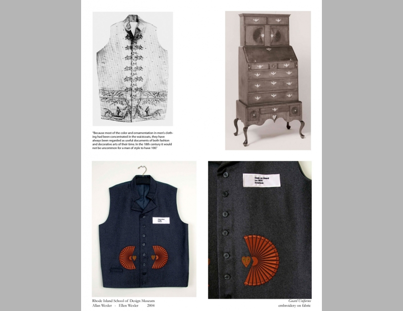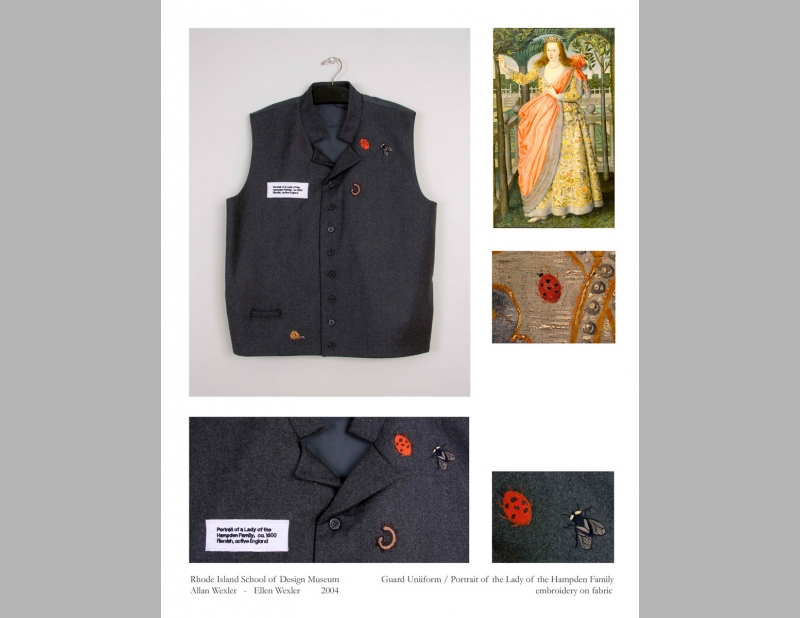 Waistcoats for RISD Museum Guards is a collection of six different uniforms to be worn by guards in the museum galleries. The style is based on a 18th century waistcoat in the museum collection Each waistcoat in the series is embroidered with elements from a specific artwork in the collection. A label sewn onto each waistcoat identifies and locates the artwork that inspired it.