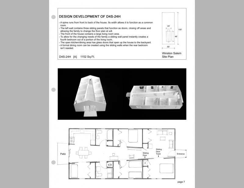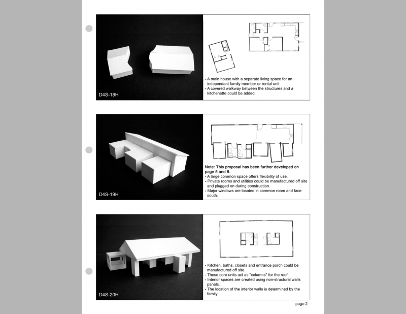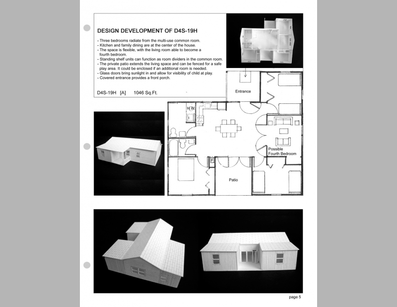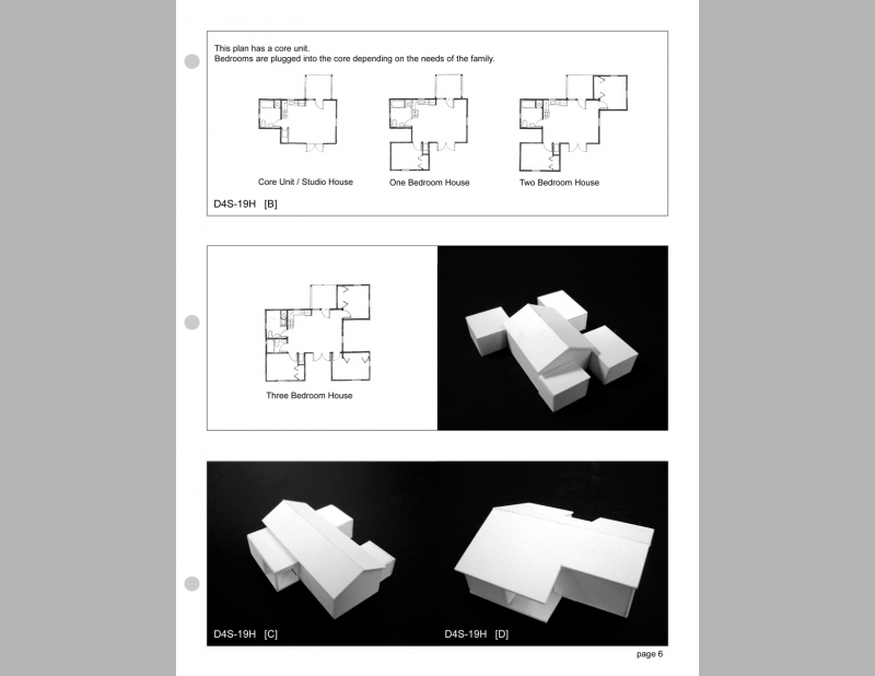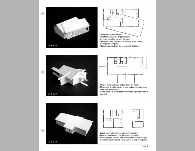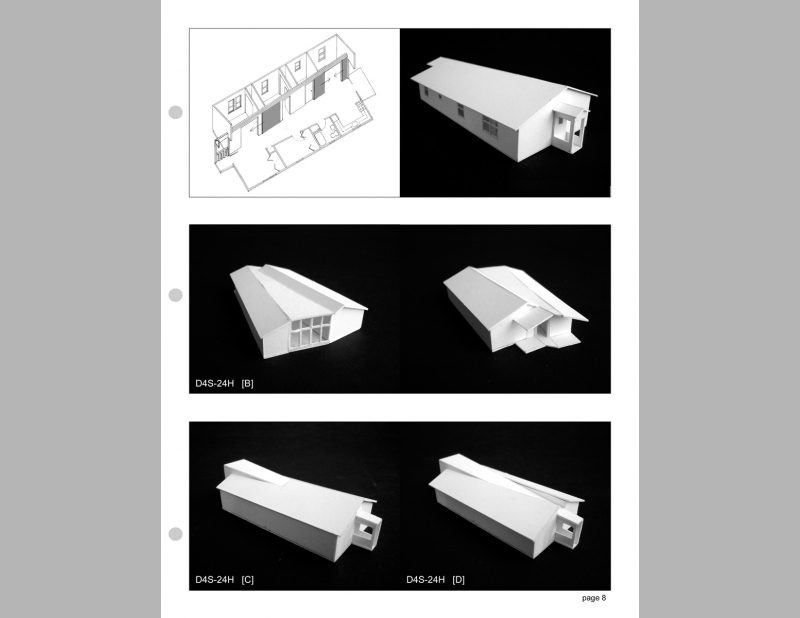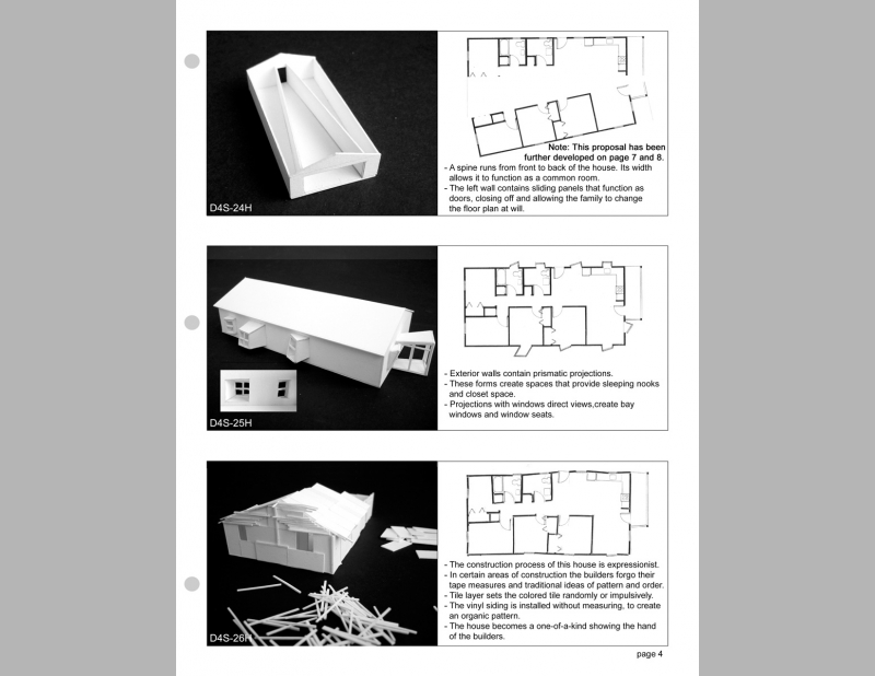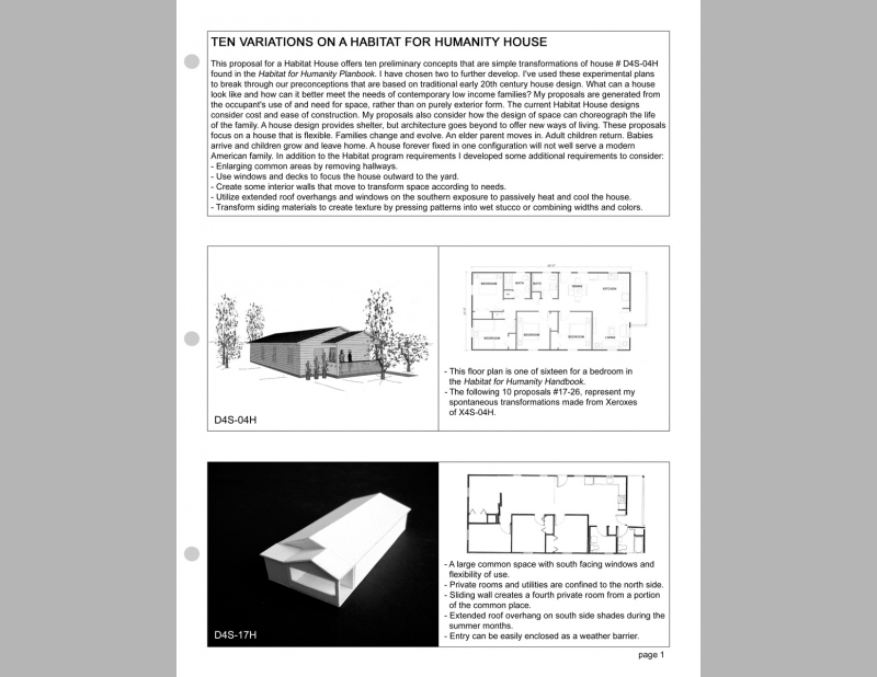 This proposal for a Habitat House offers ten preliminary proposals that are simple transformations of house #D4S-25H in the existing "Habitat for Humanity Planbook". Up to this point I have chosen only two to further develop. I’ve used these experimental proposals to break through our preconceptions based on the traditional early 20th century house design. What does a house look like and how it can better meet the needs of contemporary low income families? These designs are generated from the occupant’s use of and need for space, rather than on exterior form. The current Habitat house designs consider cost and ease of construction. These proposals also consider how the design of space can choreograph the life of the family. A house design provides shelter, but architecture goes beyond to offer ways of living.