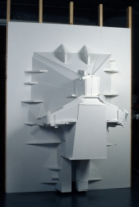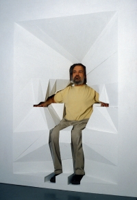 tailored men’s clothing. To construct I Want to Become Architecture I sat like a model having his portrait made. I gave instructions to my assistant as he assembled flat, hard, trapezoidal and triangular plywood planes against my rounded and soft skin. These unresponsive bits of plywood formed around me until a protective pixilated shell enveloped my body. I Want to Become Architecture is a 52-year-old Allan Wexler specific chair.